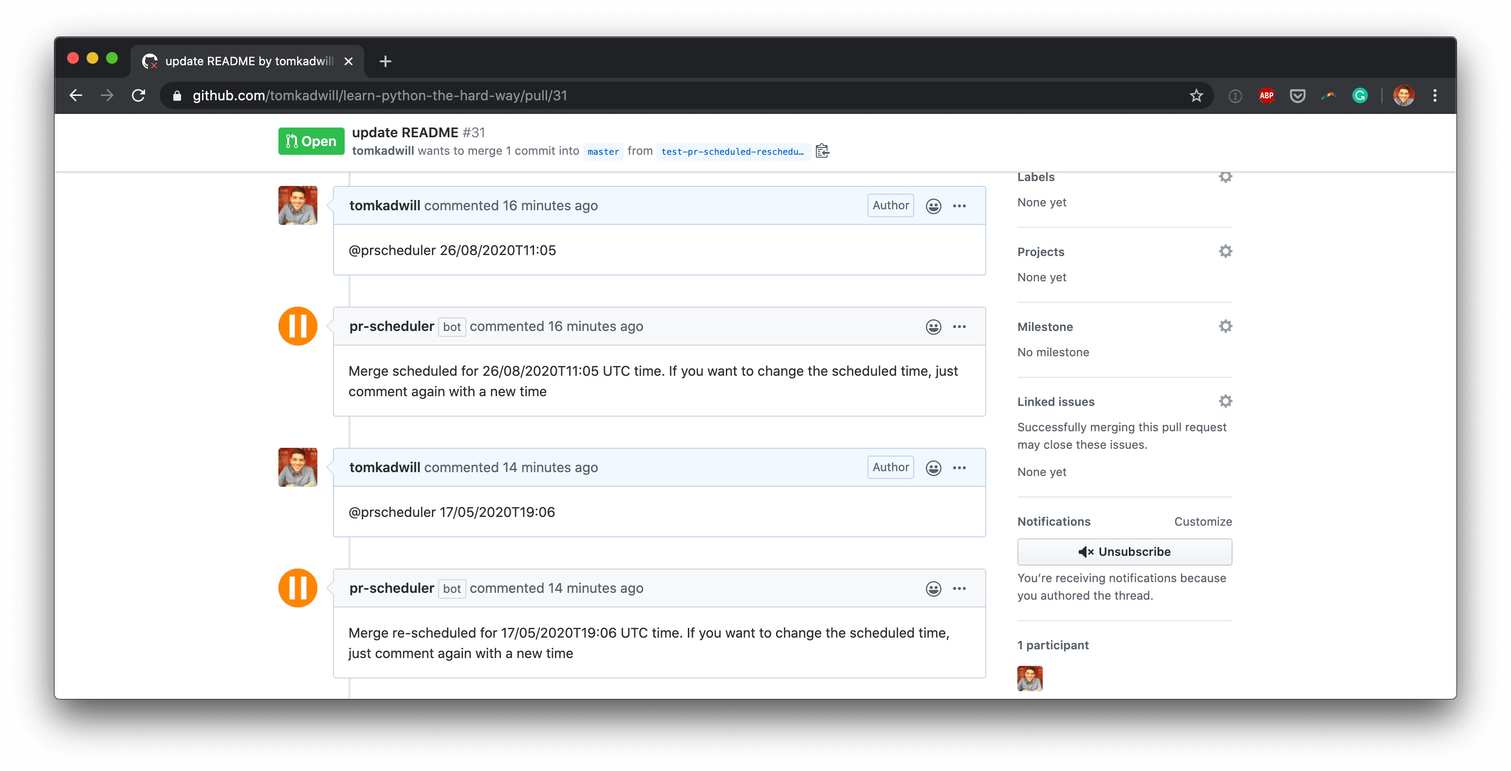PR Scheduler is a GitHub App that allows developers to schedule pull requests to be merged at a specific date and time. It works great for scheduling blog posts on static content frameworks like Jekyll and Octopress. Traditional blogging platforms, such as WordPress, allow blog posts to be scheduled but static sites don't have this functionality. There are a few different ways to solve this problem but PR Scheduler is quick and simple.